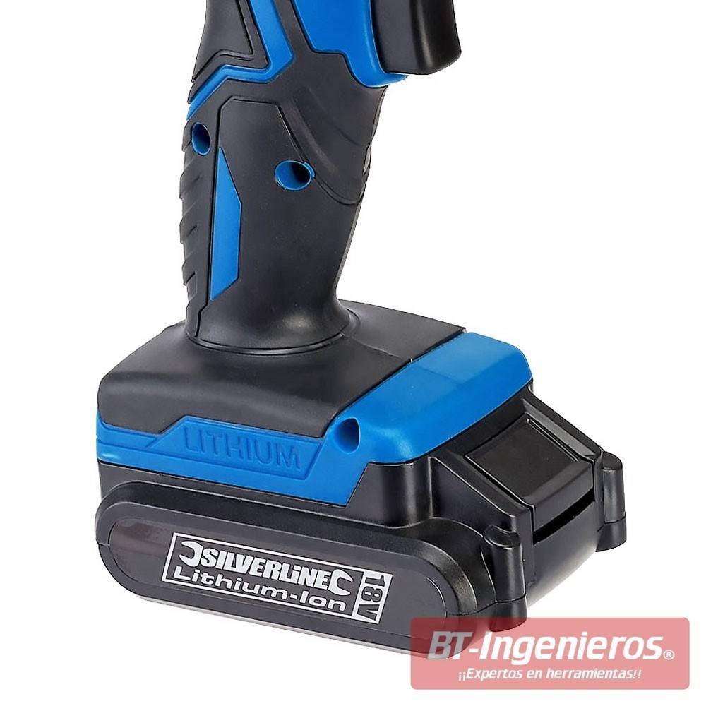 - Taladro atornillador a batería de litio 18V para atornillado y perforación en madera o acero, con par de torsión máximo de 22 Nm regulable en 16 posiciones.