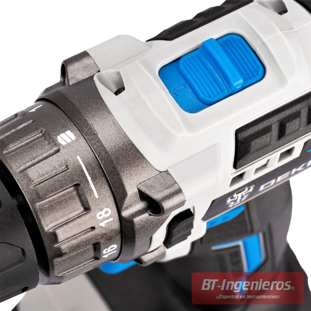 Taladro Brushless DEKO con batería de 20V 1.5 Ah. con una gran potencia y tamaño compacto con 18(+1) ajustes de par de torsión hasta 42 Nm. y 2 velocidades (0-450|0-1800 rpm)