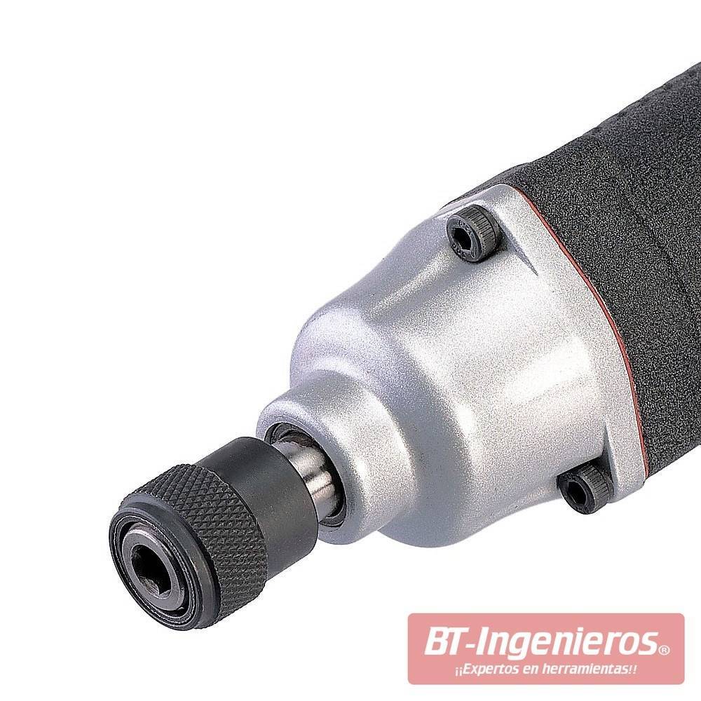 Atornillador neumático con cuerpo recto, diseñado para aplicaciones industriales, carpintería, electricista, automoción, juguetes o cadenas de montaje de vehículos pesados. Fabricado bajo normativa ISO 12100 y EN 11148-6