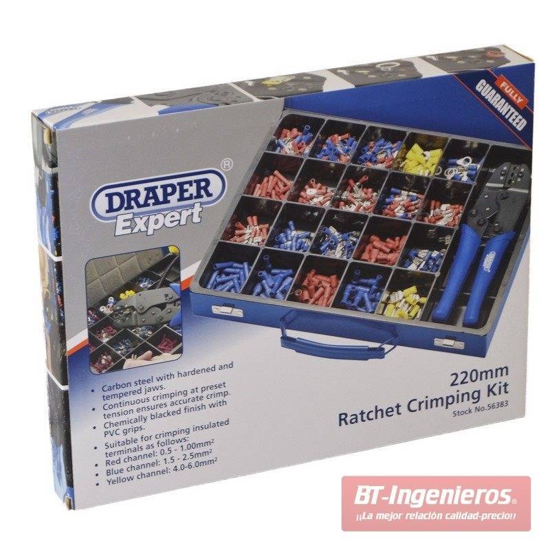 Juego de 594 piezas constituido por alicate crimpador con carraca de calidad profesional y diferentes modelos de conectores y terminales para uso en electrónica y electromecánica.