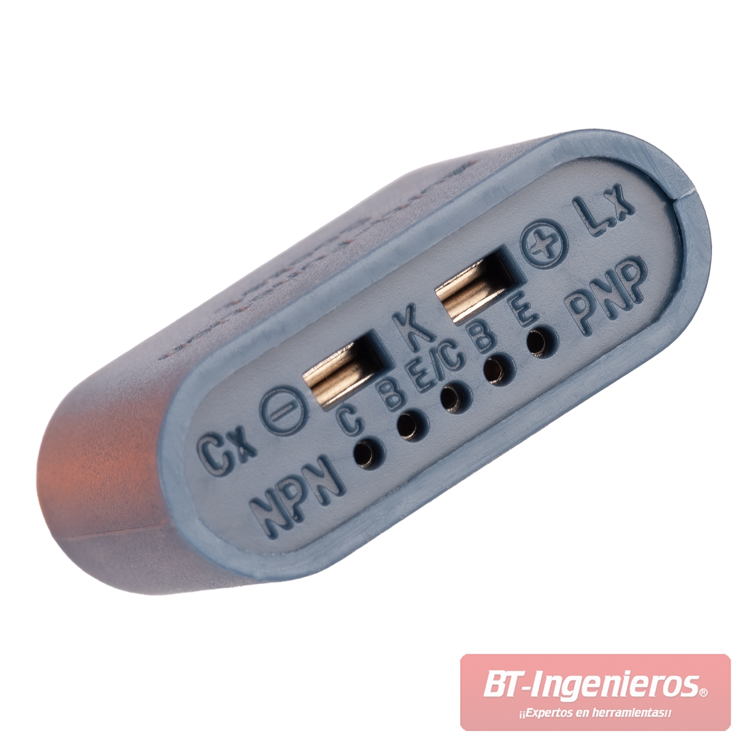 Sujeción cómoda con una sola mano, toma multifunción para prueba de transistores, carcasa de plástico que protege contra caídas o golpes, toma y pie de apoyo.