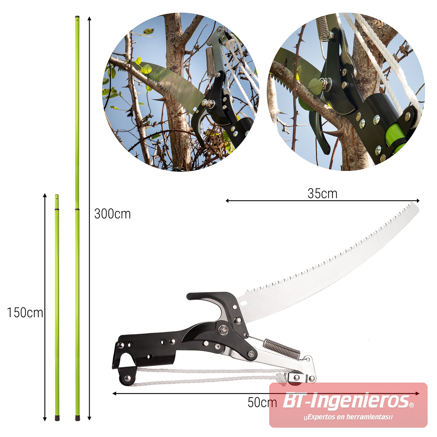 Podadora de Pértiga 3 Metros – Tijera de Cuerda y Sierra Curva de 355 mm para Poda en Altura