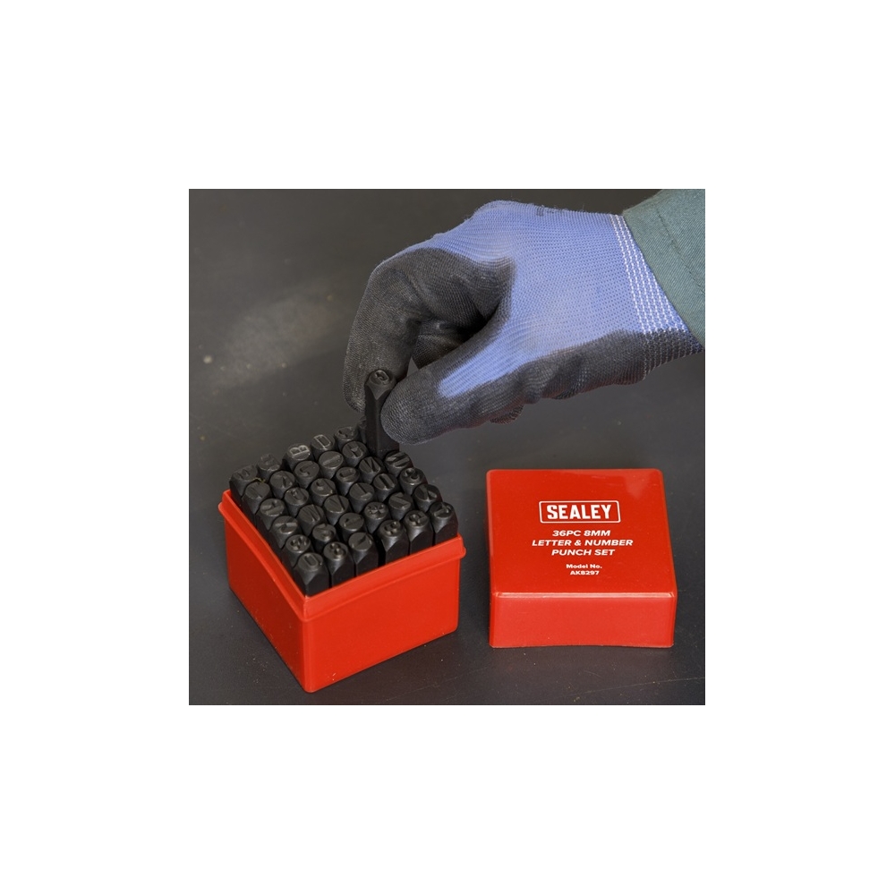 Juego de troqueles de letras y números Sealey AK8297, con un total de 36 punzones fabricados en acero al carbono para larga durabilidad y resistencia.