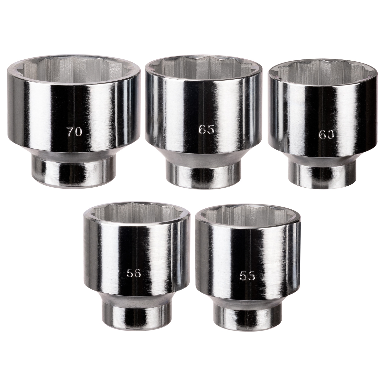 Juego profesional de llaves de vaso de 3/4" de acero Cromo Vanadio. Incluye las medidas 55, 56, 60, 65 y 70 mm.